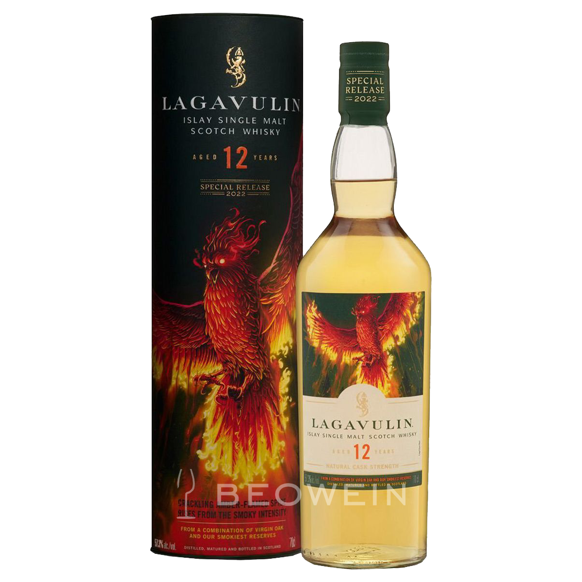 Für die Abbildung auf dem Lagavulin 12 Jahre Special Release 2022 wird eine Legende herangezogen über einen Phönix, der am Tag der Wiedergeburt des Königs von Islay aus der Asche des Landes aufstieg und mit seinen Flammenschwingen – ähm – die Stills von Lagavulin befeuerte.