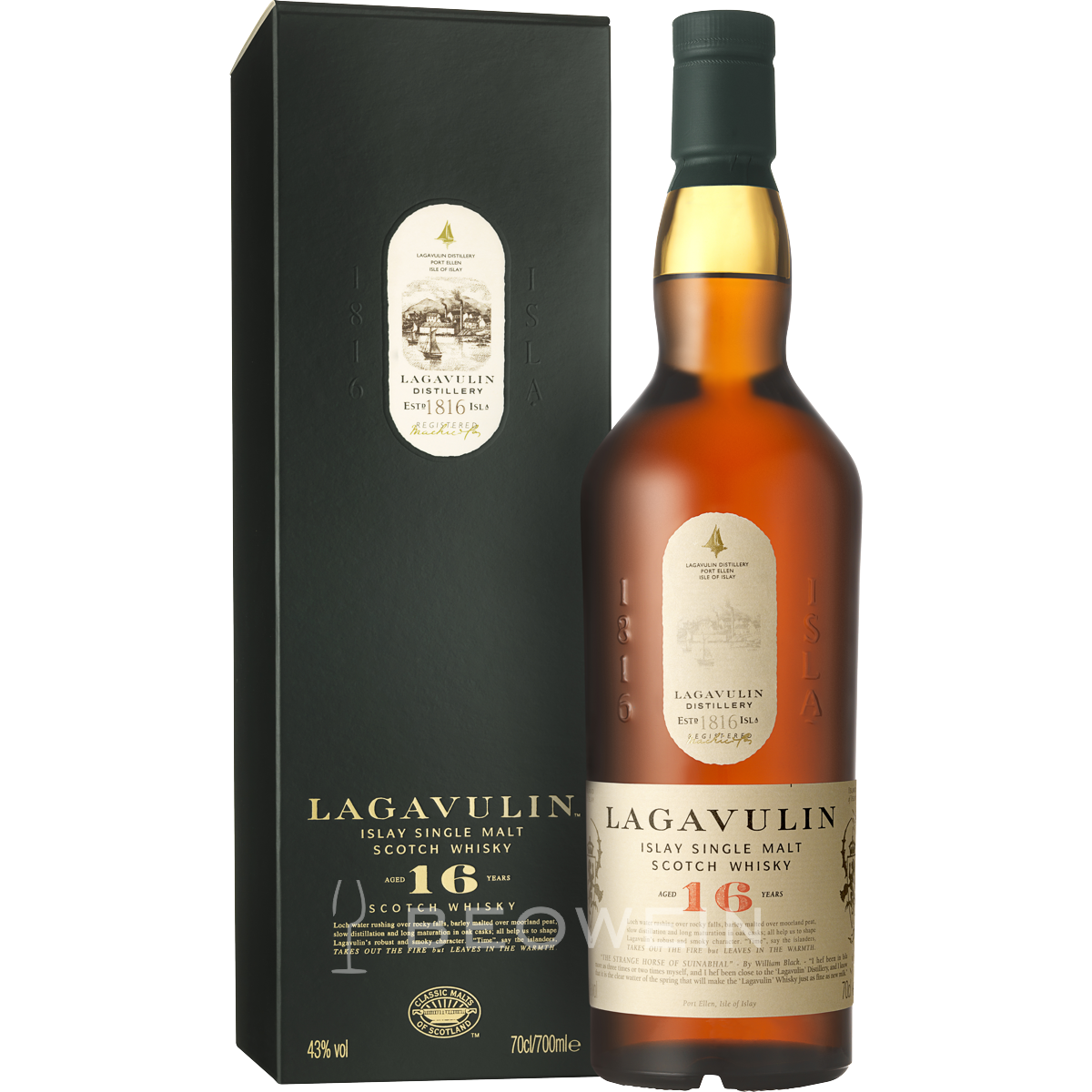 Lagavulin 16 Jahre ist einer der gefeiertsten Whiskys Schottlands, von überwältigender Komplexität, souverän, maskulin und unverwechselbar rauchig. Er weist alle Attribute eines Islay Malts auf, hebt sich jedoch von anderen durch seine besondere Geschmackstiefe und Trockenheit ab. Lagavulin ist wohl der würzigste Islay Malt, charakteristisch robust, mit schwerem, kraftvollem Aroma. Sein durchaus gewöhnungsbedürftiger Geschmack ist für den erfahrenen Whisky-Genießer immer wieder ein großartiges Erlebnis. Nach ungewöhnlich langer Reifezeit auf Flaschen gezogen, ist Lagavulin 16 Jahre ein Malt Whisky, der mit Verstand genossen sein will.